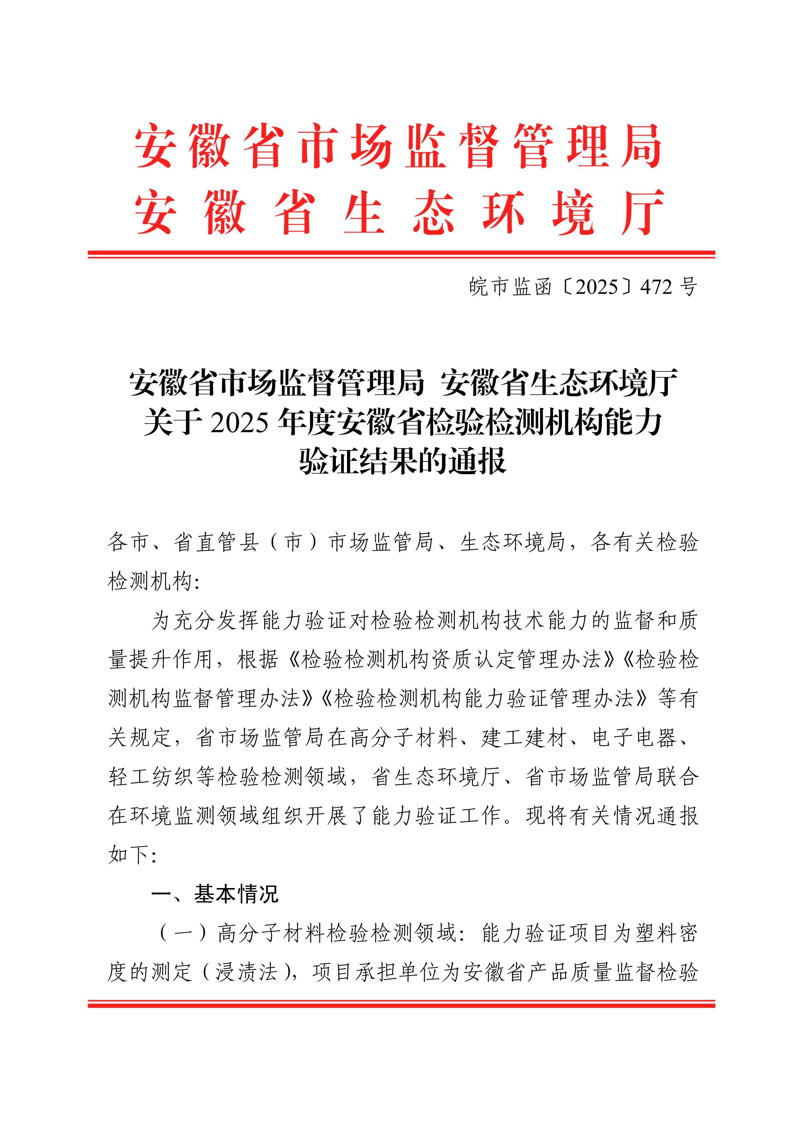 近日,安徽省市場監(jiān)督管理局、安徽省生態(tài)環(huán)境廳聯(lián)合發(fā)布了《2025年度安徽省檢驗檢測機構能力驗證結果的通報》。安徽寰宇工程質量檢測有限公司在高分子材料、建工建材兩個檢驗檢測領域的能力驗證中,均取得“合格”結果,充分展現(xiàn)了公司過硬的技術實力和可靠的質量管理能力。 ...